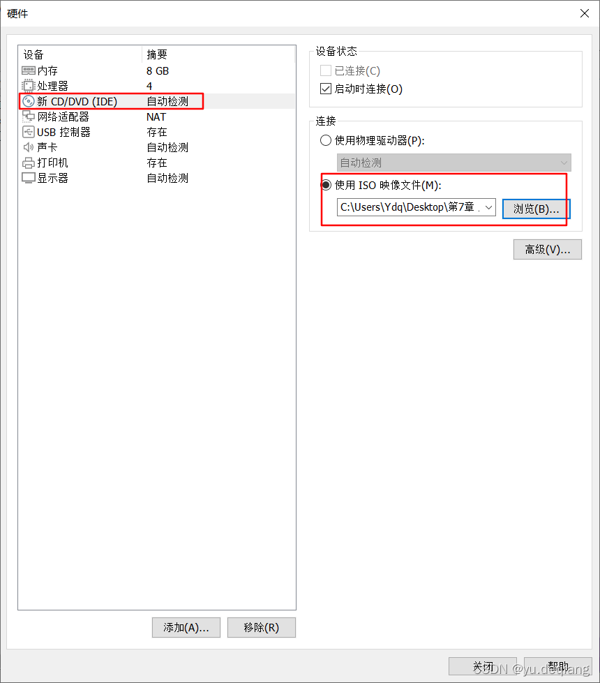 18、选择新CD、DCD,右侧选择使用ISO镜像文件,浏览安装的镜像系统,选择好后点击关闭。