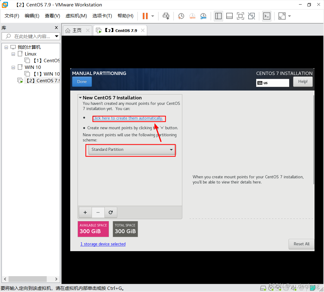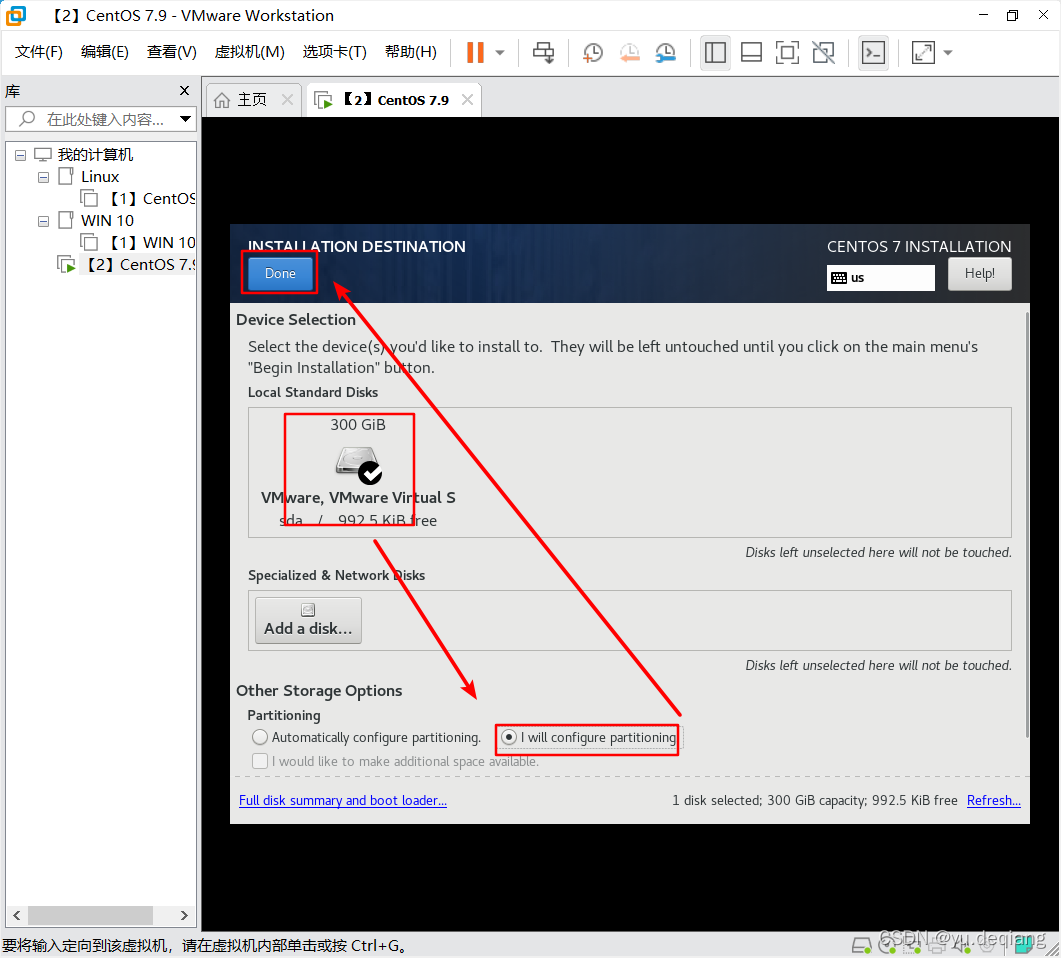 24、先选中300G的空间,再点击I will configure partitioning(我来配置分区),再点击done