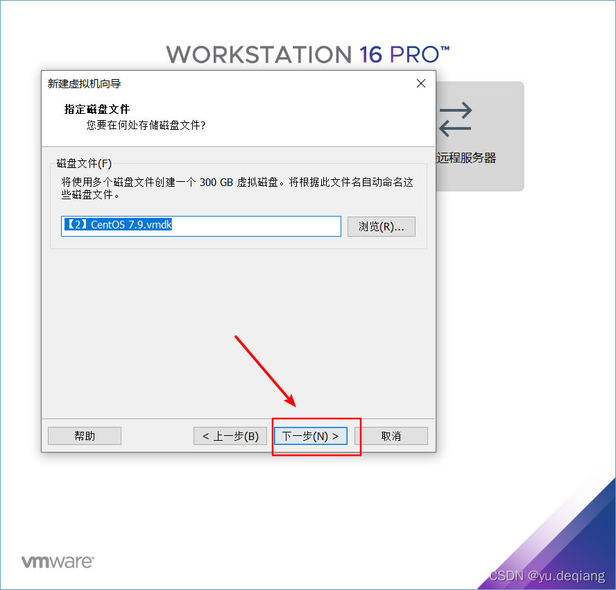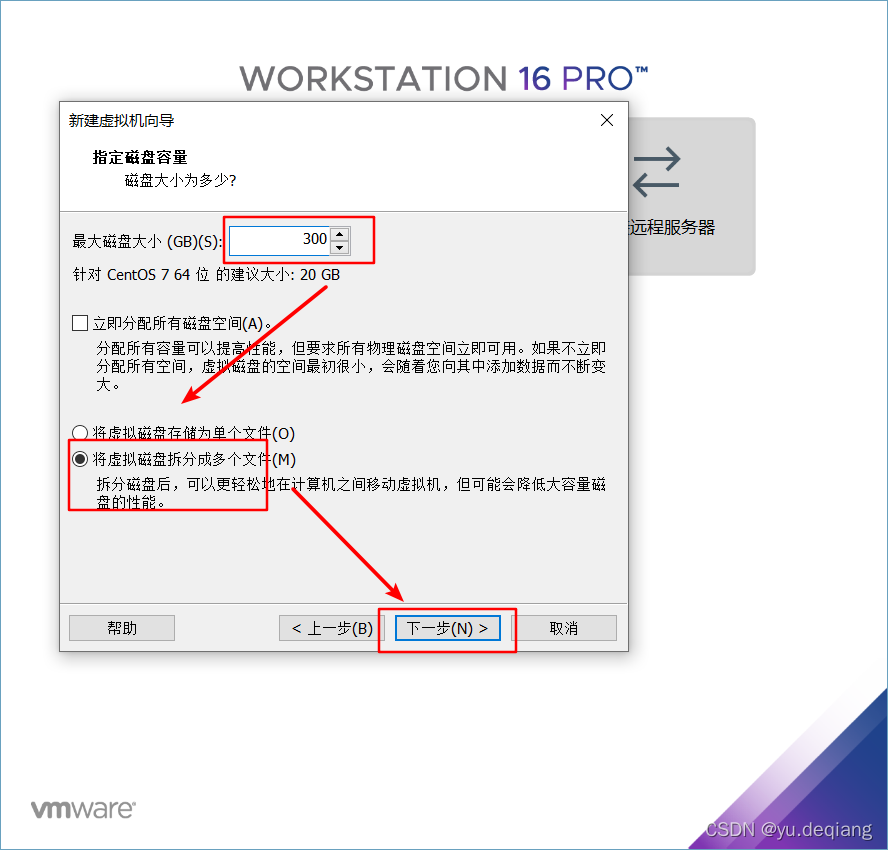 14、磁盘空间给300G,选择将虚拟机磁盘拆分成多个文件,然后点击下一步