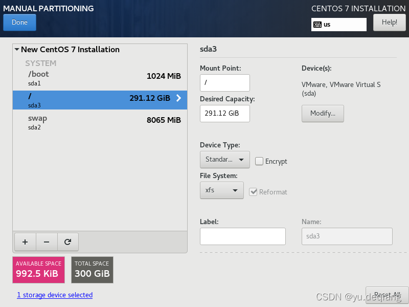 27、但自动分区将/home目录分给太多区域,/home目录不需要这么多,我们需要将这目录空间全部分给根目录。(点击下面的+号可以增加分区,点击-号可以删除分区),分区结束后,点击done。