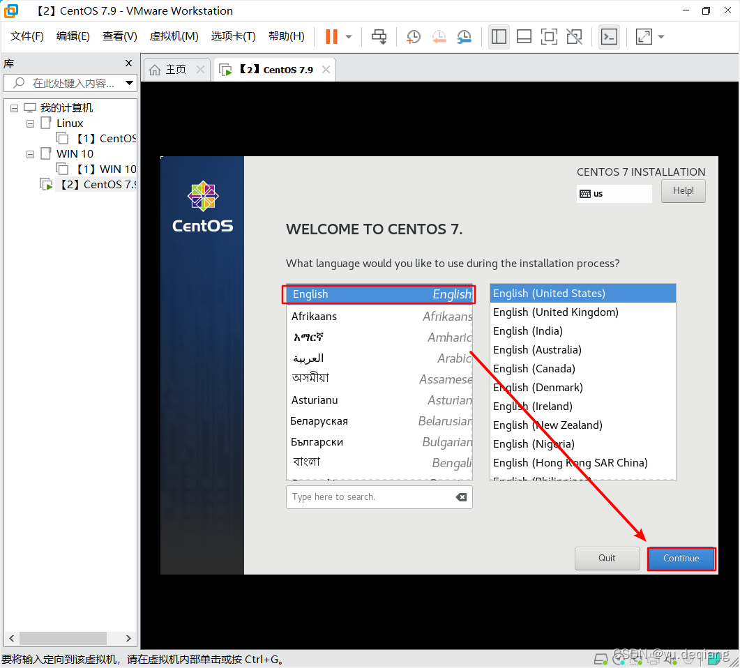 22、进来之后可以选择语言界面,这边推荐使用英文,如果想使用中文,可以往下翻找到中文。然后点击Continue(继续)。