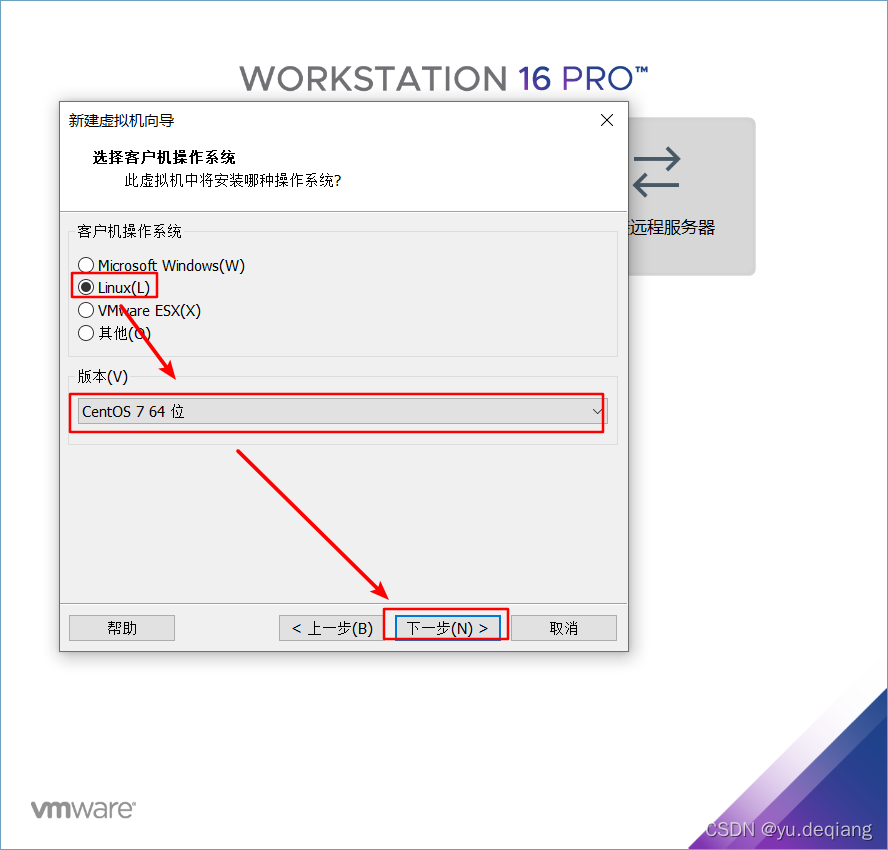 6、因为安装的是linux操作系统,所以选择linux,版本选择为CentOS 7 64位,然后点击下一步。
