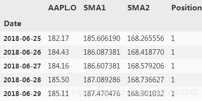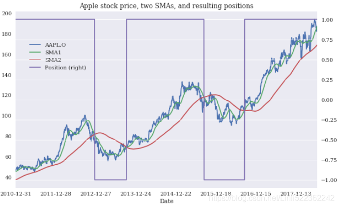 Sell signal: Go short (= -1)做空 when the shorter SMA is below the longer SMA.