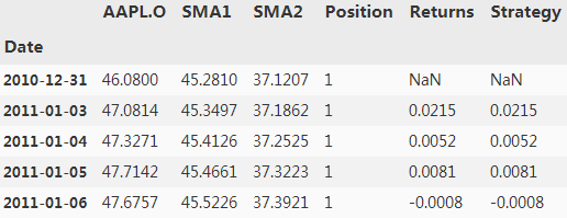 This replicates the results derived in Chapter 8. What is not addressed there is if following the trading rules — i.e., implementing the algorithmic trading strategy — is superior compared to the benchmark case of simply going long on the Apple stock over the whole period. Given that the strategy leads to two periods only during which the Apple stock should be shorted, differences in the performance can only result from these two periods.