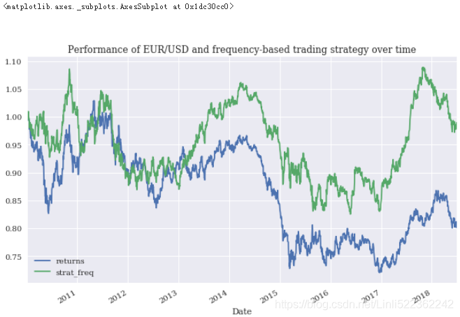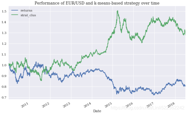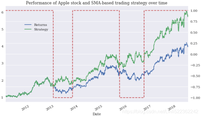 The numbers show that the algorithmic trading strategy indeed outperforms the benchmark investment of passively(被动地) holding the Apple stock(Strategy:5.811299 > Returns:4.017148). Due to the type and characteristics of the strategy, the annualized volatility is the same(0.250), such that it also outperforms the benchmark investment on a riskadjusted basis.