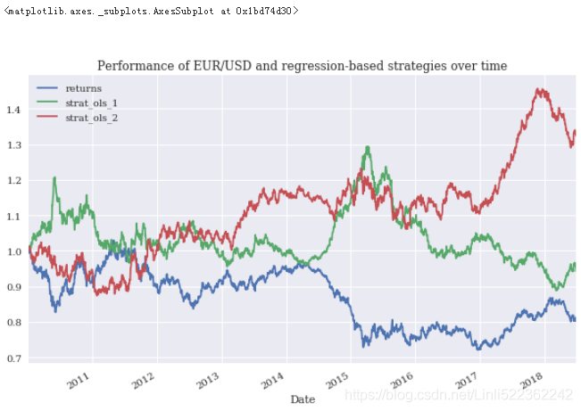 Second, the vectorized backtesting of the resulting trading strategies. Figure 15-12 visualizes the performance over time: