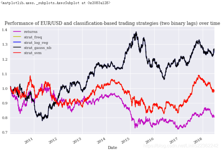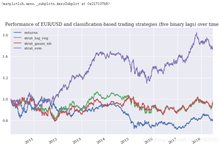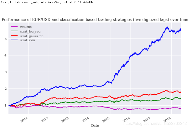 In an attempt to improve the strategies’ performance, the following code works with five binary lags instead of two. In particular, the performance of the SVM-based strategy is significantly improved(see Figure). On the other hand, the performance of the LR- and GNB-based strategies is worse: