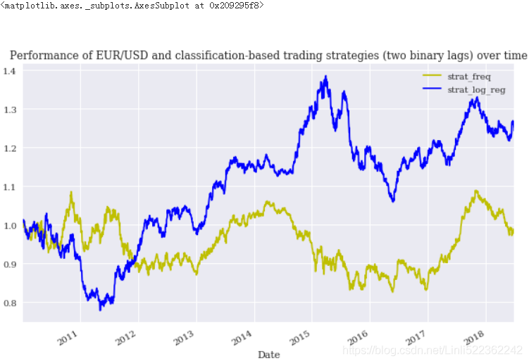 title='Performance of EUR/USD and classification-based trading strategies (two binary lags) over time',