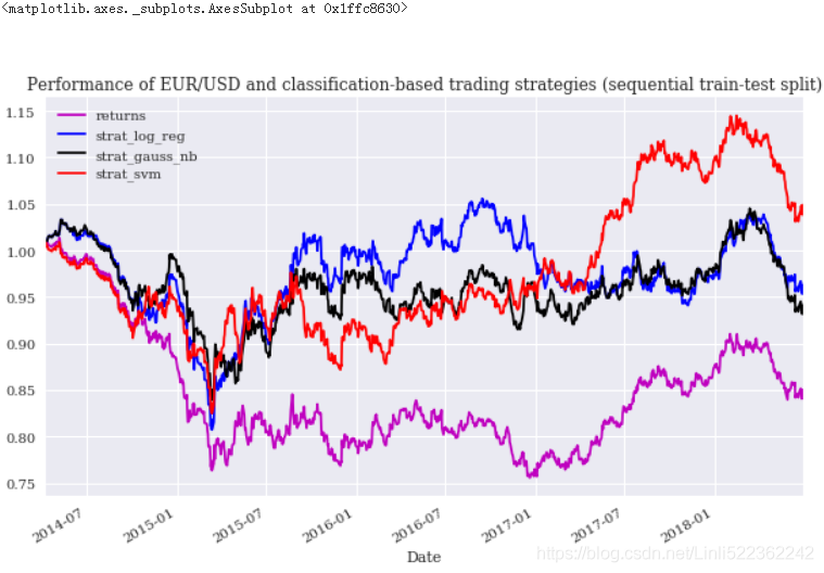 title='Performance of EUR/USD and classification-based trading strategies (sequential train-test split)'