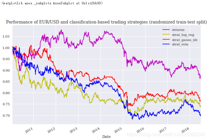 title='Performance of EUR/USD and classification-based trading strategies (randomized train-test split)'