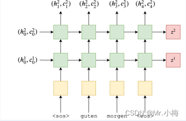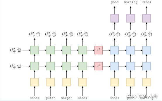 上图显示了一个示例翻译。输入/源句子“guten morgen”通过嵌入层(黄色),然后输入到编码器(绿色)。我们还将序列的开头<sos>和序列的结尾<eos>标记分别附加到句子的开头和结尾。在每个时间步长中,编码器RNN的输入是当前单词的嵌入向量e(xt),以及上一个时间步长中的隐藏状态ht-1,编码器 RNN 将输出新的隐藏状态ht .到目前为止,我们可以将隐藏状态视为句子的向量表示。RNN 可以被认为是e(xt) 和ht-1的函数: