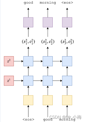 每个时间步长输出单个令牌。第一层将接收来自上一个时间步长的隐藏和单元格状态,和当前词的token yt,以产生新的隐藏和单元格状态