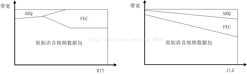 上图中左边的坐标系中,纵坐标是带宽,横坐标是 RTT。在RTT比较小的网络情况下,ARQ分配的带宽比较多,不采用FEC;在RTT比较大的情况下,FEC分配的带宽比较多,不采用ARQ。不管使用ARQ还是FEC冗余数据包进行信道保护,原始语音视频数据所占的带宽都要适当牺牲。
