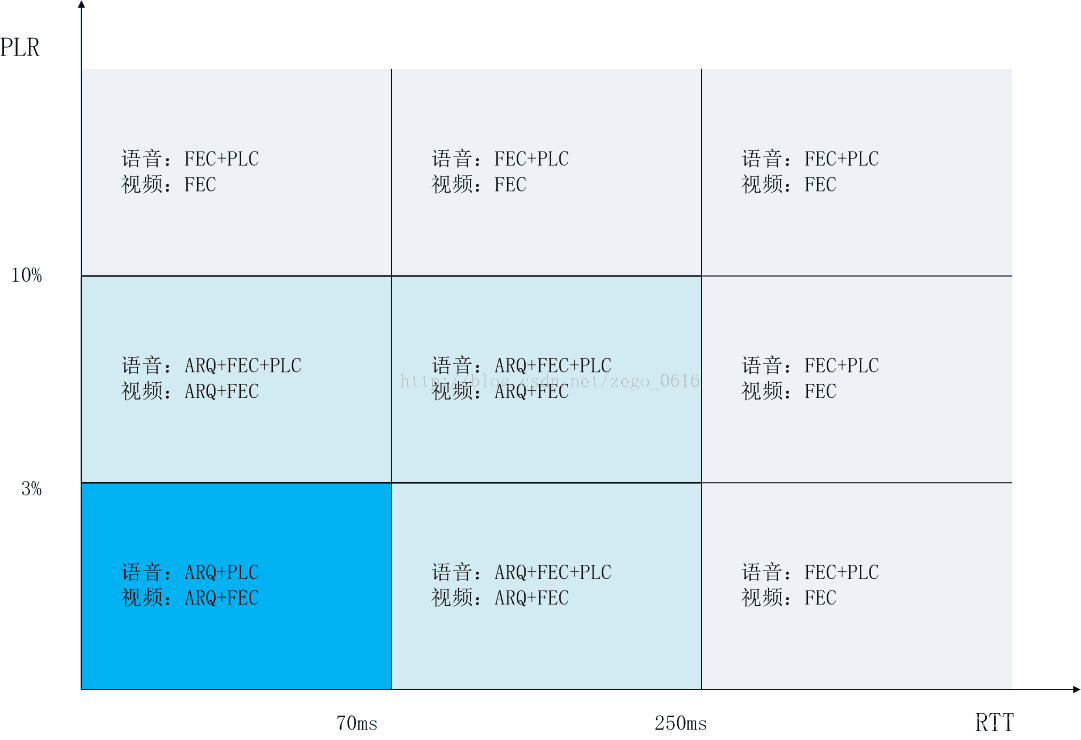 3) 中间的情形:在 (RTT<=250ms 而且 PLR<=10%) 的前提下, RTT>=70ms 或者 PLR>=3% 的情况,可以根据成本和体验的考虑,智能地选择使用 FEC 和 ARQ 的权重。