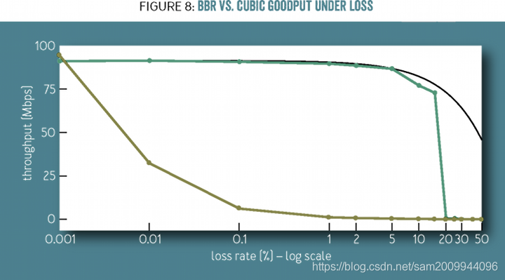 当繁忙的网络出现大幅丢包时,BBR的表现也远好于CUBIC算法。下图中,丢包率从0.001%到50%时,可以看到绿色的BBR远好于红色的CUBIC。大约当丢包率到0.1%时,CUBIC由于不停的触发拥塞算法,所以吞吐量极速降到10Mbps只有原先的1/10,而BBR直到5%丢包率才出现明显的吞吐量下降。