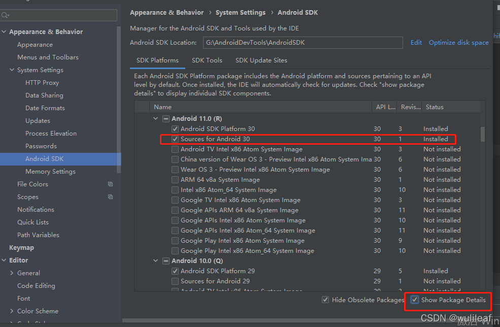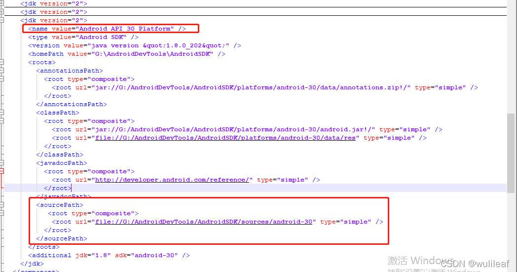 一般在:C:\Users\Administrator\.AndroidStudio3.5\config\options下找到一个jdk.table.xml的文件,用编辑器打开(Notepad++),找到对应的Api(本文是30)配置项中的sourcePath标签配置下面图片中的配置即可!