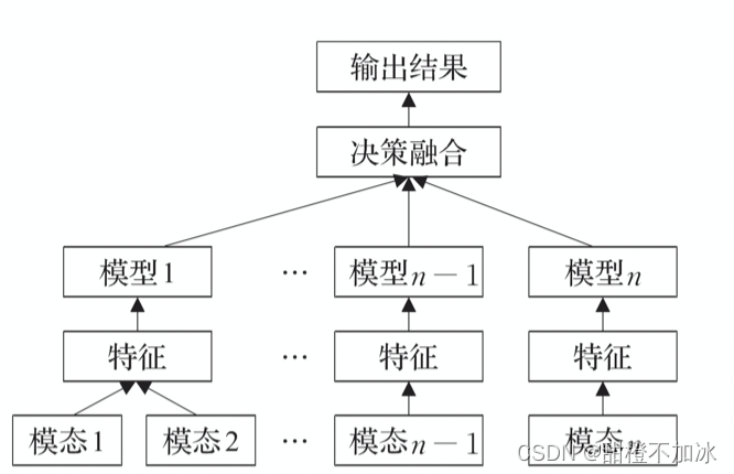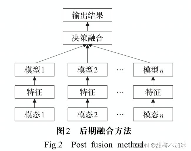 后期融合:也称为决策层融合,指的是在每种模态都做出决策(分类或回归)之后才进行的融合。进行后期融合,需要使用相应的模型对不相同的模态进行训练,再对这些模型输出的结果进行融合。该融合方式可以处理简单的数据异步性,允许使用最适合分析每种单一模态的方法,如音频使用隐马尔可夫模型(Hidden Markov Model,HMM)、图像使用可支持向量机(Support Vector Machines,SVM)