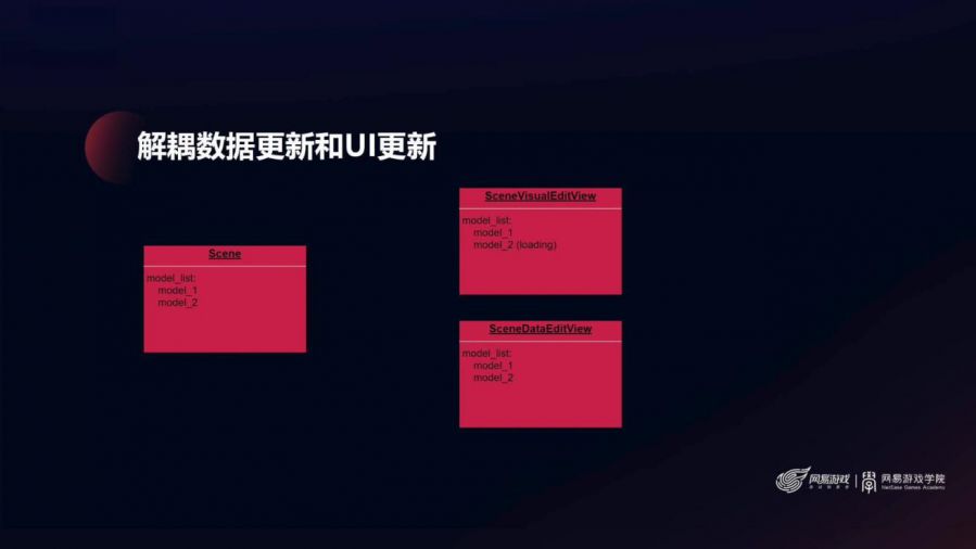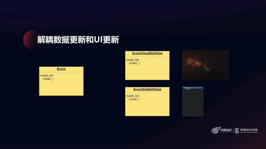 这里是一个例子,讲的是当数据的更新和UI的更新解耦之后带来的好处。举例来说,在一个场景编辑器中,我们有一个UI列表展示场景中所有的模型,同时有一个场景窗口提供场景的预览和编辑。