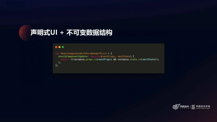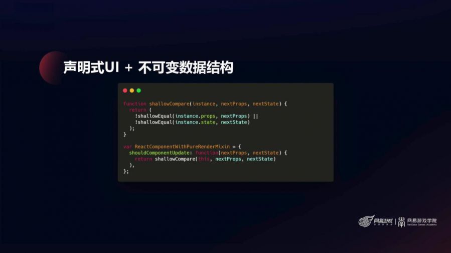在传统的情况下,这个时候就会依赖重载比较来判断这个界面是不是需要更新。如果你使用不可变数据结构来表达内部的状态,这个比较就会变得非常简单了,所以实际上声明式UI和不可变数据结构本身就是可以很好的组合在一起。