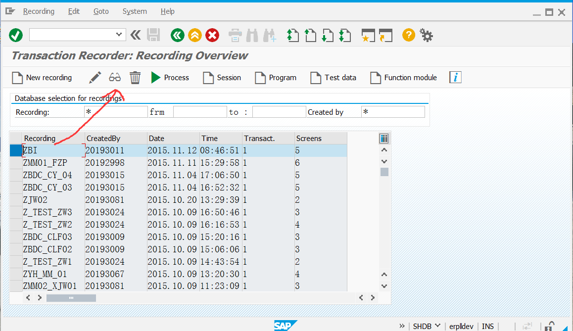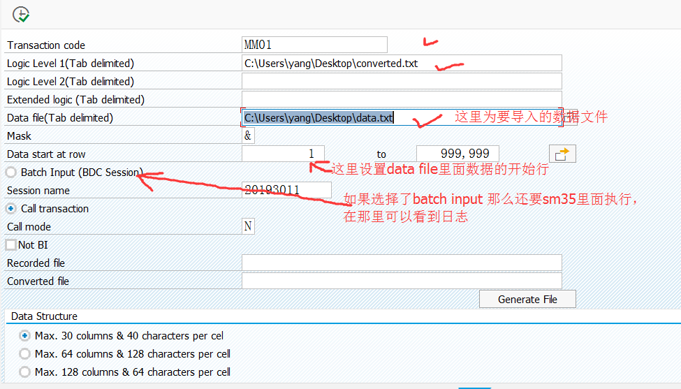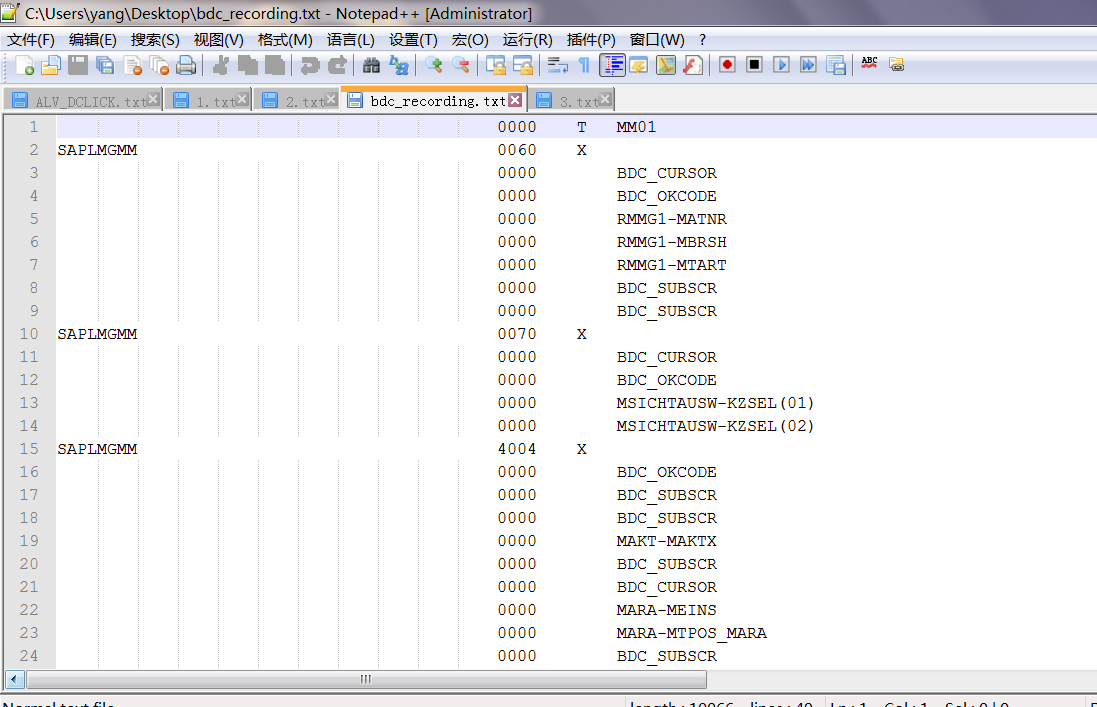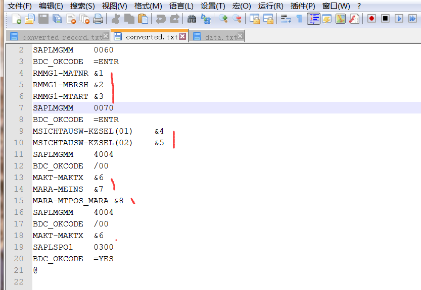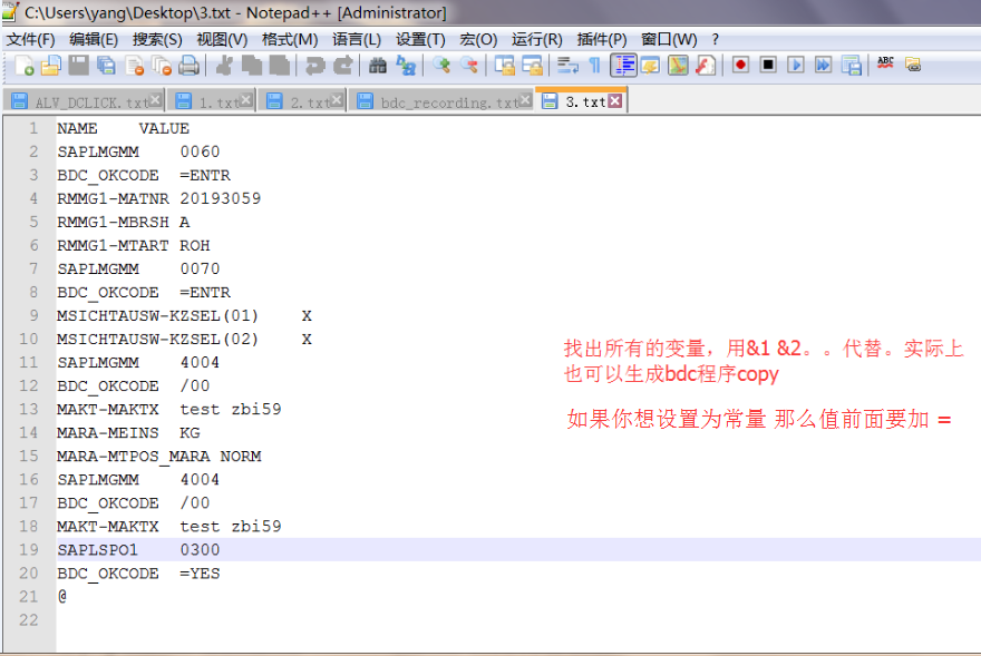 然后根据你的需要修改,设置变量和常量,变量就用&1 &2这些代替,常量的话就在常量前面加上 = 号。屏幕SAPLMGMM不用管。下面我没设置常量