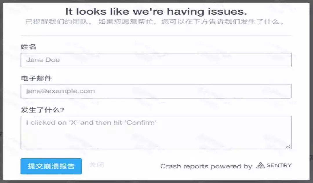 捕获用户反馈的的方法是在sentry的beforeSend hook里调用 showReportDialog方法。这样子,当错误发生时,客户端就会弹出让用户填写错误信息的弹窗。