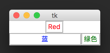from tkinter import * root = Tk() lbred = Label(root,text="Red",fg="Red",relief=GROOVE) lbred.pack() lbgreen = Label(root,text="绿色",fg="green",relief=GROOVE) lbgreen.pack(side=RIGHT) lbblue = Label(root,text="蓝",fg="blue",relief=GROOVE) lbblue.pack(fill=X) root.mainloop()