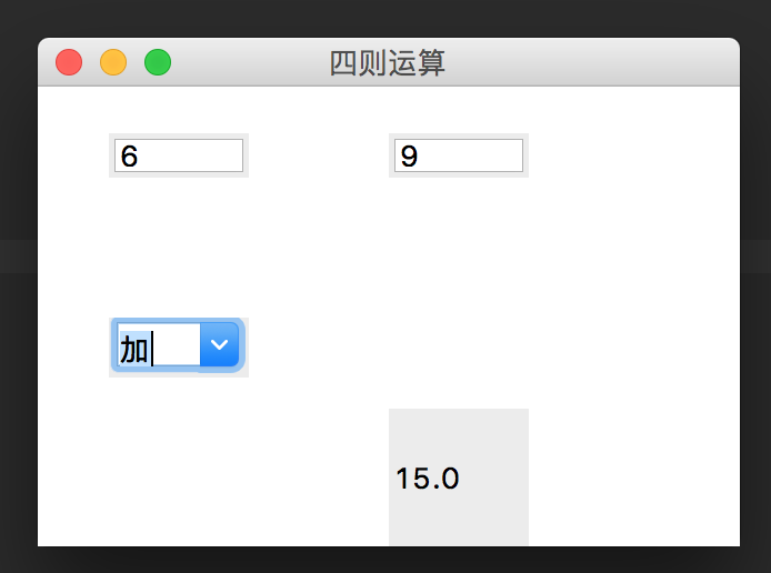 from tkinter.ttk import * def calc(event): a = float(t1.get()) b = float(t2.get()) dic = {0:a+b,1:a-b,2:a*b,3:a/b} c = dic[comb.current()] lbl.config(text=str(c)) root = Tk() root.title('四则运算') root.geometry('320x240') t1 = Entry(root) t1.place(relx=0.1,rely=0.1,relwidth=0.2,relheight=0.1) t2 = Entry(root) t2.place(relx=0.5,rely=0.1,relwidth=0.2,relheight=0.1) var = StringVar() comb = Combobox(root,textvariable=var,values=['加','减','乘','除',]) comb.place(relx=0.1,rely=0.5,relwidth=0.2) comb.bind('<<ComboboxSelected>>',calc) lbl=Label(root,text='结果') lbl.place(relx=0.5,rely=0.7,relwidth=0.2,relheight=0.3) root.mainloop()