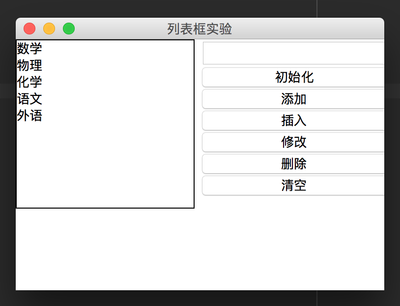 方法 功能描述 curselection() 返回光标选中项目编号的元组,注意并不是单个的整数 delete(起始位置,终止位置) 删除项目,终止位置可省略,全部清空为delete(0,END) get(起始位置,终止位) 返回范围所含项目文本的元组,终止位置可忽略 insert(位置,项目元素) 插入项目元素(若有多项,可用列表或元组类型赋值),若位置为END,则将项目元素添加在最后 size() 返回列表框行数 执行自定义函数时,通常使用“实例名.surselection()” 或 “selected” 来获取选中项的位置索引。由于列表框实质上就是将Python 的列表类型数据可视化呈现,在程序实现时,也可直接对相关列表数据进行操作,然后再通过列表框展示出来,而不必拘泥于可视化控件的方法。看下面的一个例子:实现列表框的初始化、添加、插入、修改、删除和清空操作,如下: