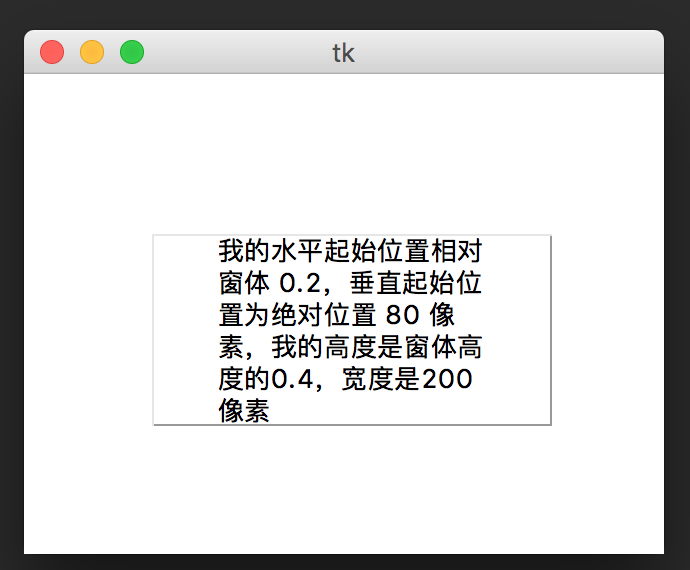 from tkinter import * root = Tk() root.geometry('320x240') msg1 = Message(root,text='''我的水平起始位置相对窗体 0.2,垂直起始位置为绝对位置 80 像素,我的高度是窗体高度的0.4,宽度是200像素''',relief=GROOVE) msg1.place(relx=0.2,y=80,relheight=0.4,width=200) root.mainloop()