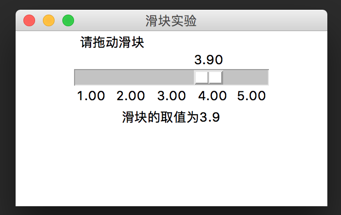 from tkinter import * def show(event): s = '滑块的取值为' + str(var.get()) lb.config(text=s) root = Tk() root.title('滑块实验') root.geometry('320x180') var=DoubleVar() scl = Scale(root,orient=HORIZONTAL,length=200,from_=1.0,to=5.0,label='请拖动滑块',tickinterval=1,resolution=0.05,variable=var) scl.bind('<ButtonRelease-1>',show) scl.pack() lb = Label(root,text='') lb.pack() root.mainloop()