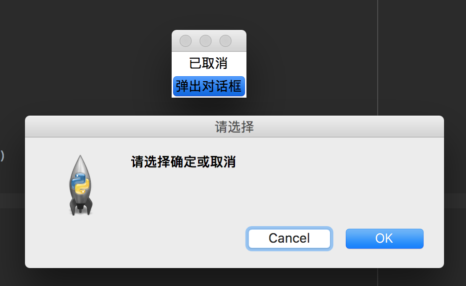 from tkinter import * import tkinter.messagebox def xz(): answer=tkinter.messagebox.askokcancel('请选择','请选择确定或取消') if answer: lb.config(text='已确认') else: lb.config(text='已取消') root = Tk() lb = Label(root,text='') lb.pack() btn=Button(root,text='弹出对话框',command=xz) btn.pack() root.mainloop()