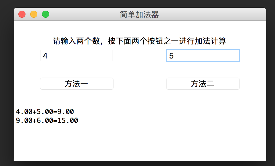 看下面的例子:1.从两个输入框去的输入文本后转为浮点数值进行加法运算,要求每次单击按钮产生的算是结果以文本的形式追加到文本框中,将原输入框清空。2.按钮方法一不传参数调用函数run1()实现,按钮“方法二”用lambda调用函数run2(x,y)同时传递参数实现。