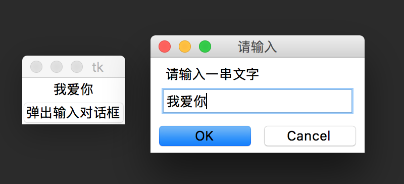 from tkinter.simpledialog import * def xz(): s=askstring('请输入','请输入一串文字') lb.config(text=s) root = Tk() lb = Label(root,text='') lb.pack() btn=Button(root,text='弹出输入对话框',command=xz) btn.pack() root.mainloop()