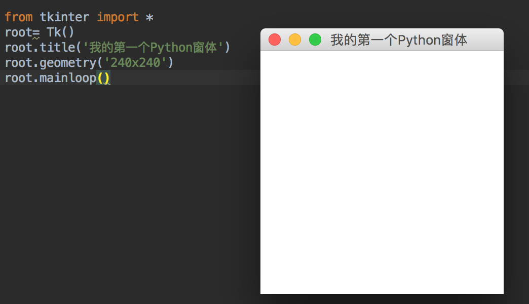 from tkinter import * root= Tk() root.title('我的第一个Python窗体') root.geometry('240x240') # 这里的乘号不是 * ,而是小写英文字母 x root.mainloop()