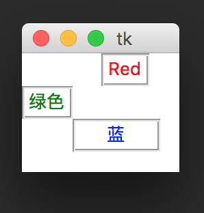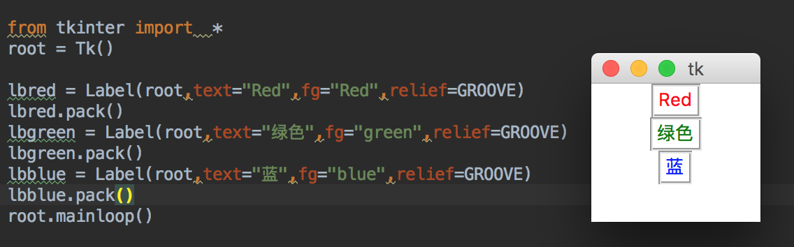 from tkinter import * root = Tk() lbred = Label(root,text="Red",fg="Red",relief=GROOVE) lbred.pack() lbgreen = Label(root,text="绿色",fg="green",relief=GROOVE) lbgreen.pack() lbblue = Label(root,text="蓝",fg="blue",relief=GROOVE) lbblue.pack() root.mainloop()