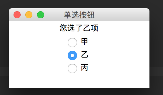 from tkinter import * def Mysel(): dic = {0:'甲',1:'乙',2:'丙'} s = "您选了" + dic.get(var.get()) + "项" lb.config(text = s) root = Tk() root.title('单选按钮') lb = Label(root) lb.pack() var = IntVar() rd1 = Radiobutton(root,text="甲",variable=var,value=0,command=Mysel) rd1.pack() rd2 = Radiobutton(root,text="乙",variable=var,value=1,command=Mysel) rd2.pack() rd3 = Radiobutton(root,text="丙",variable=var,value=2,command=Mysel) rd3.pack() root.mainloop()