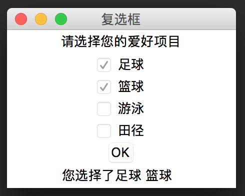 如下的例子: 利用复选框实现,单击OK,可以将选中的结果显示在标签上。效果如下: