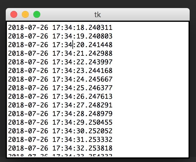 from tkinter import * import time import datetime def gettime(): s=str(datetime.datetime.now())+'\n' txt.insert(END,s) root.after(1000,gettime) # 每隔1s调用函数 gettime 自身获取时间 root=Tk() root.geometry('320x240') txt=Text(root) txt.pack() gettime() root.mainloop()
