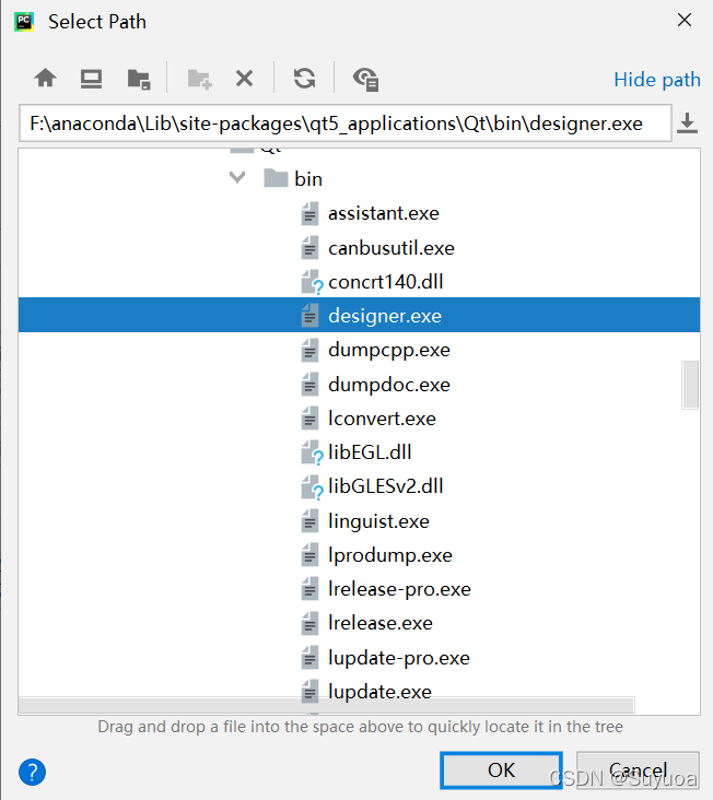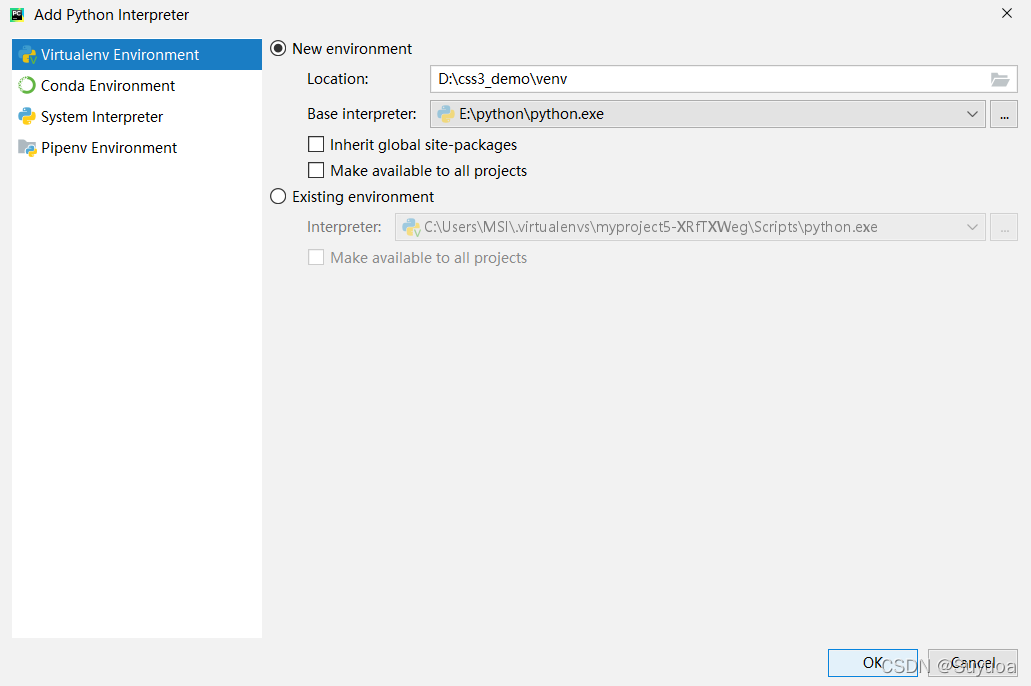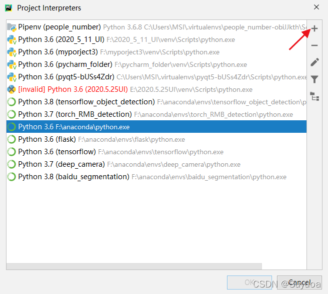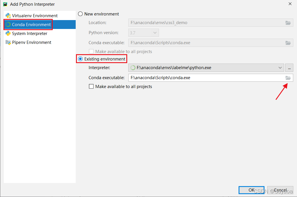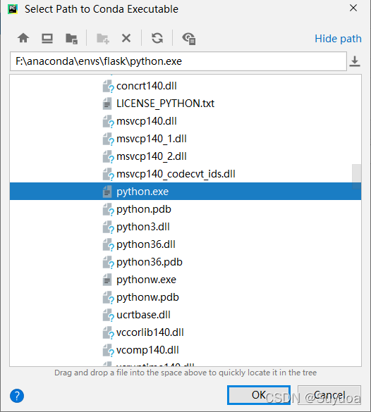 如果是使用anaconda创建的环境,在anaconda的安装目录下的envs会产生一个名为环境名称的文件夹,里面会有python.exe,我们找到python.exe,然后点击OK就可以了