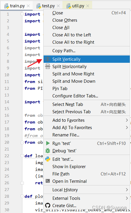 这个时候我们右键点击test.py,然后点击Split Vertically
