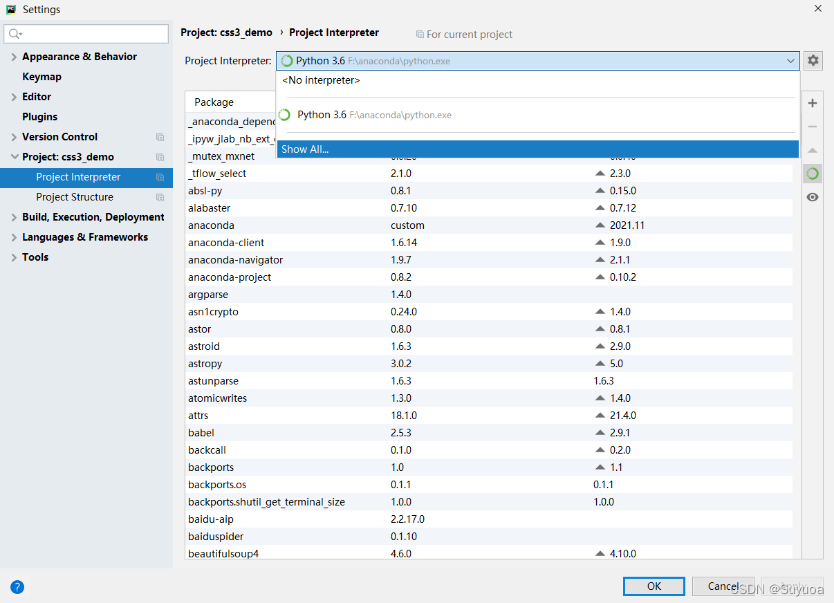 搜索Project Interpreter会出现这个页面,默认都会有一个环境,如果没有想要的环境,我们点击Show All