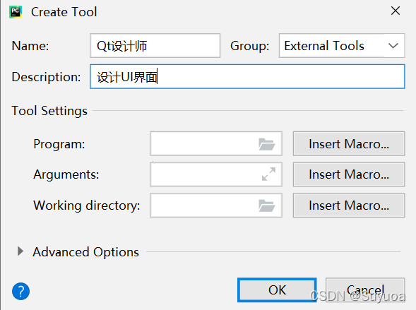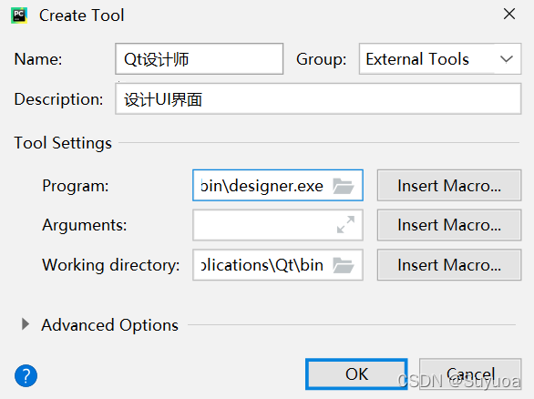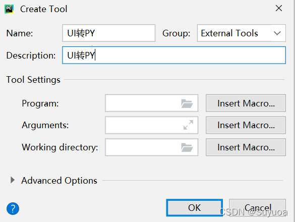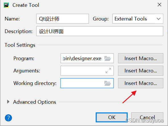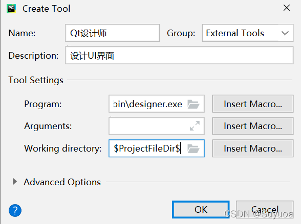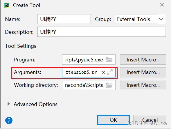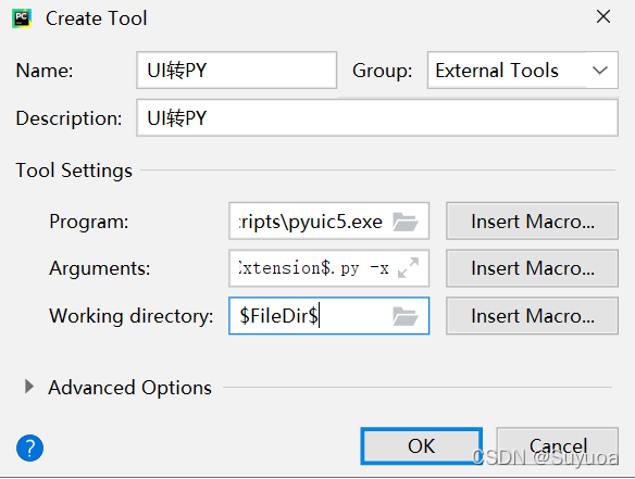 之后我们再修改工作目录,我们通常把UI文件与转换的PY文件放在同一路径下,所以我们选择 $FileDir$