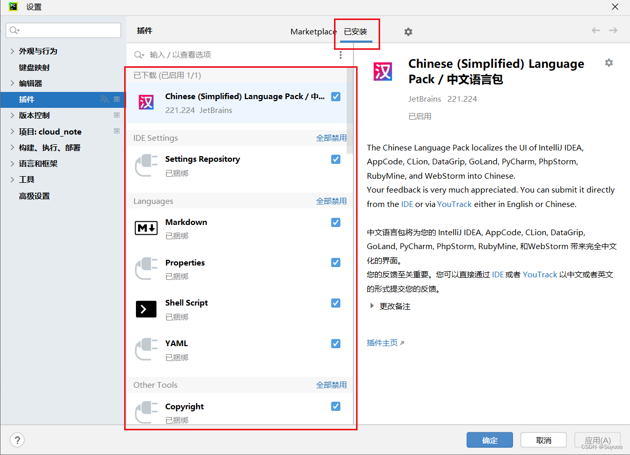 在设置(settings)的已安装(Installed)中可以通过右侧的对勾来决定是否使用插件