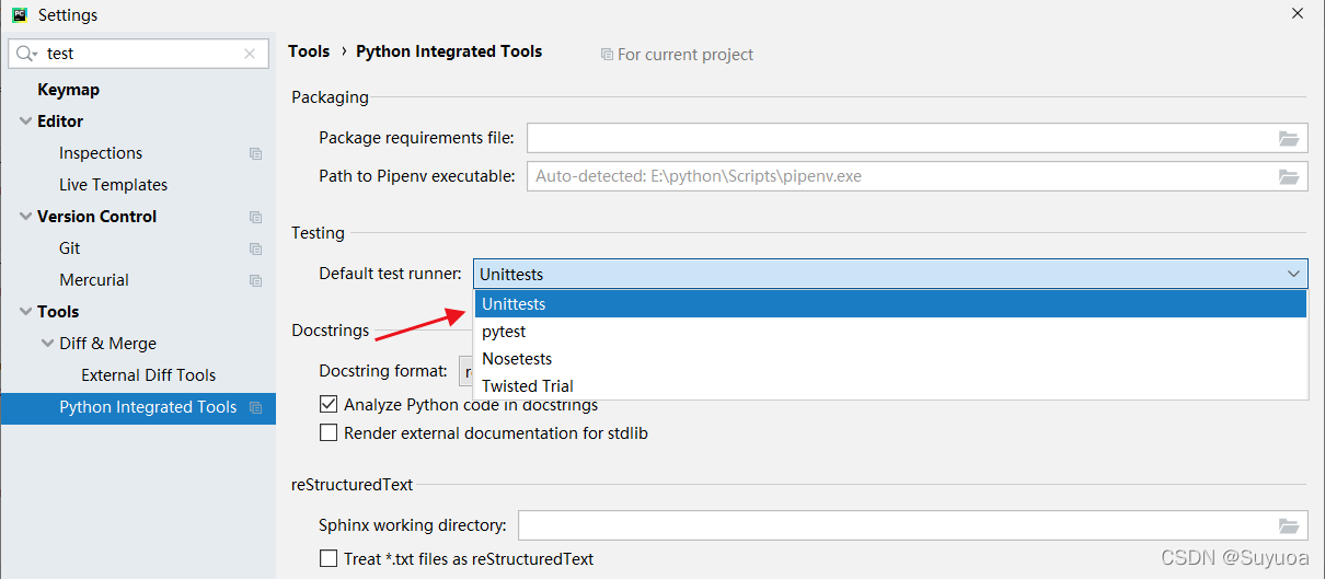搜索test,找到Python Integrated Tools,将其中的Default test runner改为Unittests