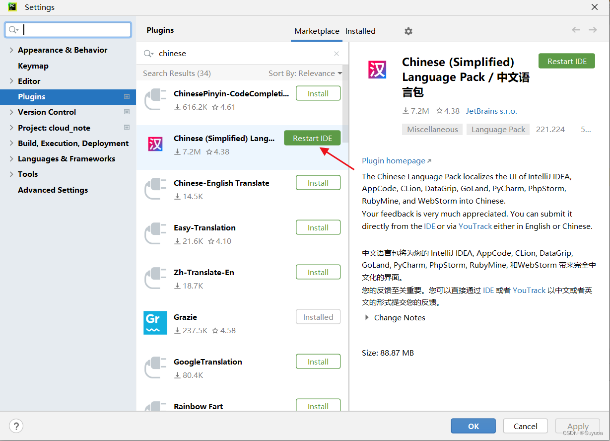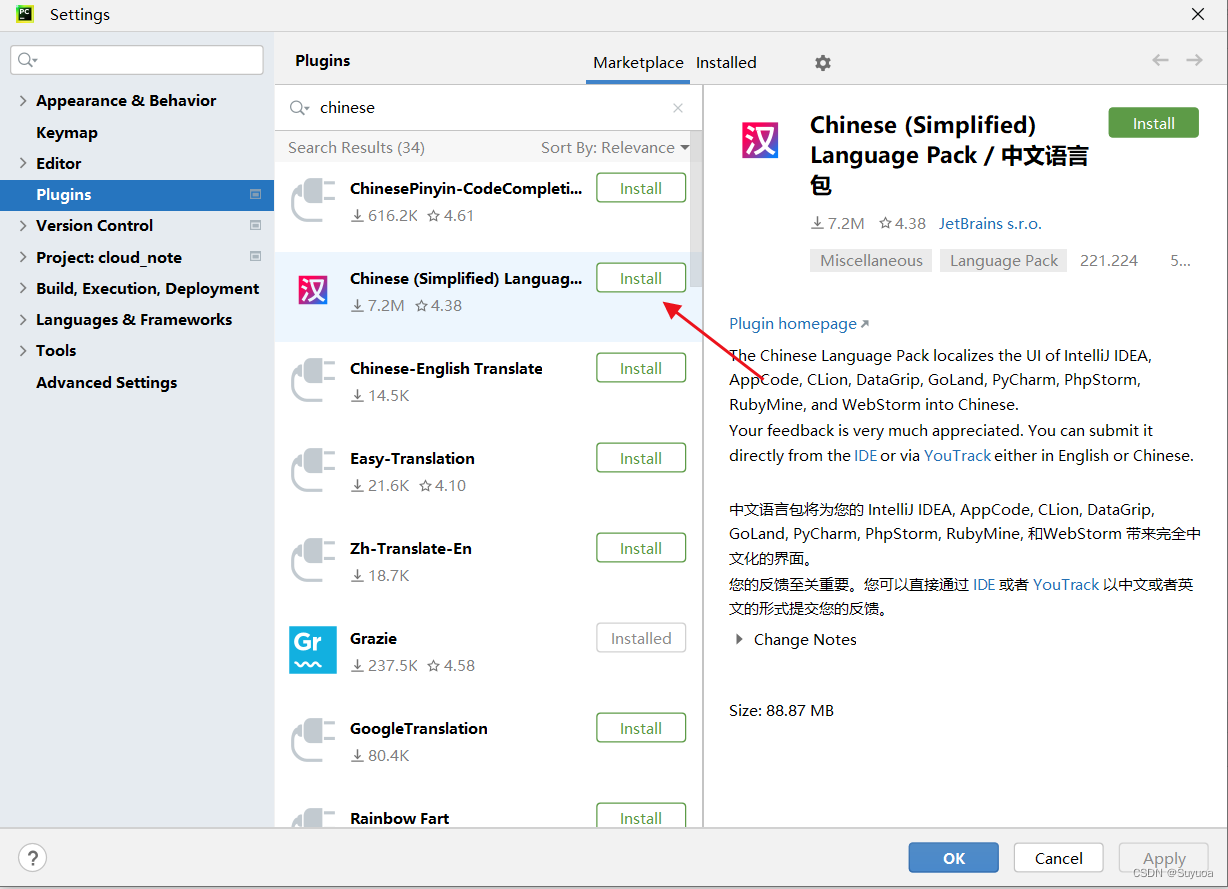 比如我现在想把pycharm的操作界面搞成中文,那么可以搜索Chines(Simplified) Language Pack / 中文语言包 插件,找到后点击Install