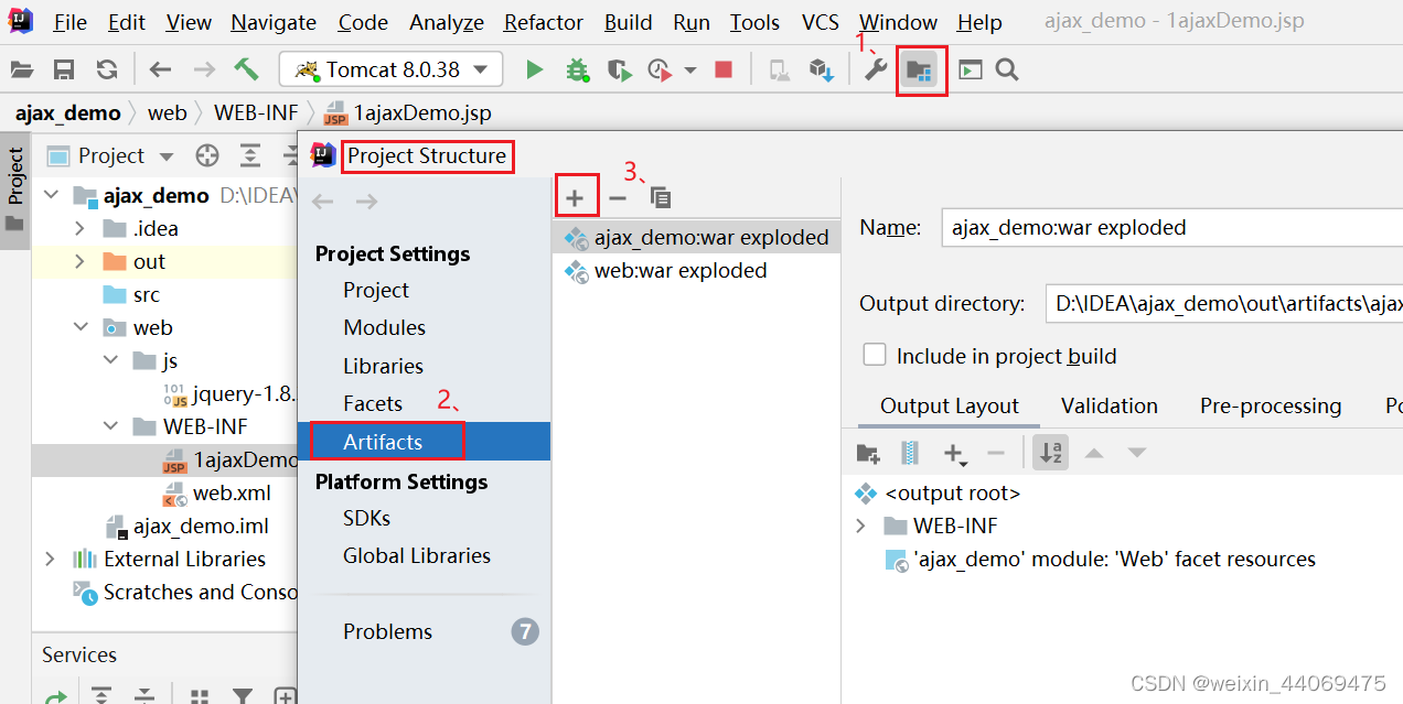 在 web-inf 下创建了一个用来测试的 .jsp 文件,点击 project structure 按钮(下图步骤1中框选的图标)