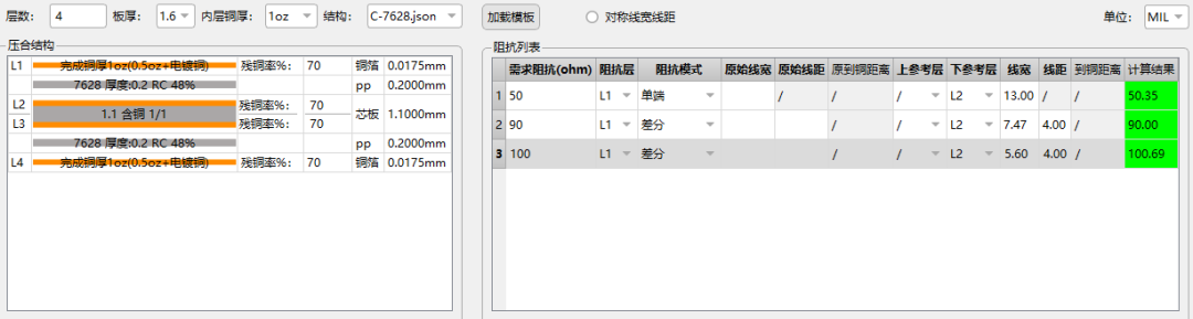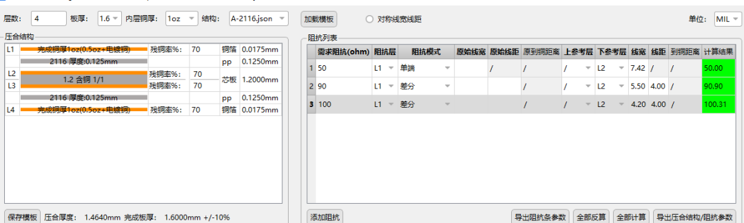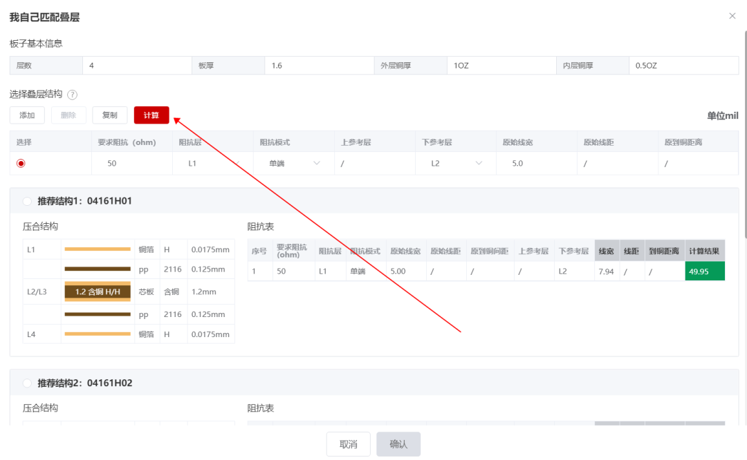 也可以选择“我自己匹配叠层”,填好基础参数后,点击“计算”,即可查看不同阻抗控制对应的线宽线距,帮助客户合理匹配叠层结构和阻抗控制。