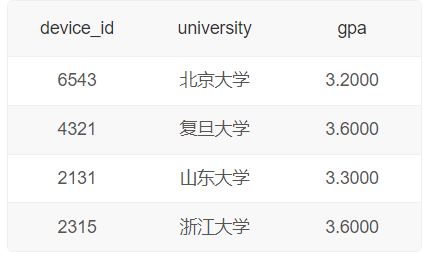 先通过子查询查找到每个学校的最低gpa,此子查询只包含university和MIN(gpa)字段,因为两者是分组字段和聚合函数,并不会造成数据聚合,所以能得到正常的每个学校对应的最低gpa,然后将子查询得出的数据与原表格中的数据进行内连接,那么就只会剩下与子查询匹配的数据,此时该数据就包含device_id、university和最低gpa字段了(这里也可以通过滑动窗口实现)