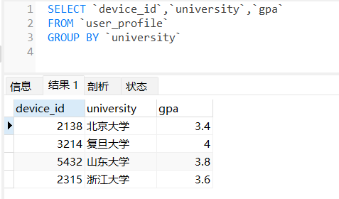 我们可以看到北京大学最小gpa虽然得到了,但是device_id却对应不上。这就是因为一对多时,select后的字段使用非分组字段(非聚合函数)造成的该字段的数据聚合,最后只保留一份随机字段值,造成数据不匹配。