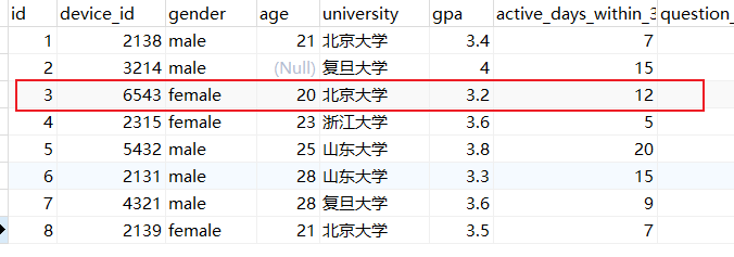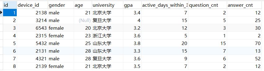 在牛客SQL33 找出每个学校GPA最低的同学问题中,该题有如下字段和数据的user_profile表格: